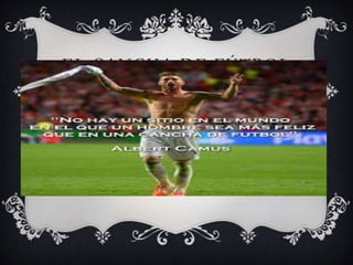 El documento habla brevemente sobre un cancha de fútbol, el deporte del fútbol y destaca a un arquero como el mejor del mundo, mencionando también el balón oficial de la FIFA.