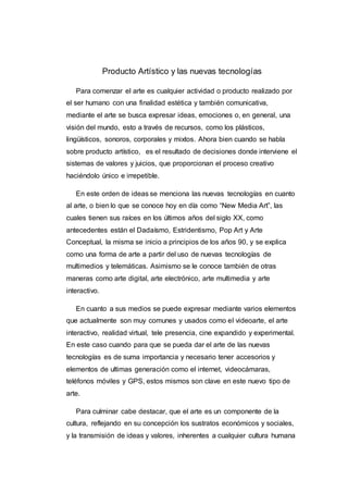 El documento describe el arte y las nuevas tecnologías. Explica que el arte nuevo media o arte de las nuevas tecnologías surgió a finales del siglo XX e involucra el uso de medios multimedia y tecnologías como videoarte, arte interactivo y realidad virtual. Señala que las nuevas tecnologías como internet, cámaras y teléfonos son fundamentales para este tipo de arte. Finalmente, concluye que el arte ha evolucionado a través del tiempo y se ha reinventado, dando lugar al arte de las nuevas tecnologías de hoy en