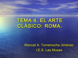 El documento aborda el arte clásico de Roma, explorando sus orígenes en el arte etrusco y helenístico, la arquitectura y urbanismo romano, así como la escultura y pintura de la época. Destaca elementos como la construcción de templos, esculturas realistas y frescos ornamentales en contextos funerarios. También se discute la transición hacia el arte paleocristiano y su simbolismo arquitectónico.