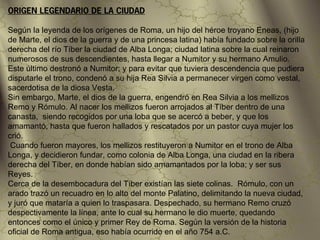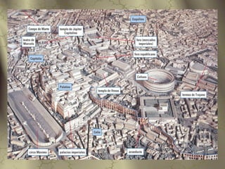 El documento resume la historia del arte en la antigua Roma, comenzando con el origen legendario de la ciudad fundada por Rómulo y Remo. Luego describe la sociedad romana y los períodos de su historia, incluido el Imperio Romano. Finalmente, resume brevemente el arte etrusco que influyó en Roma.