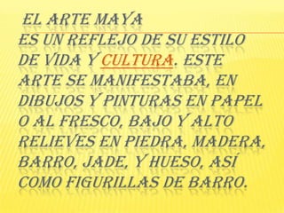 El arte maya se manifestaba a través de dibujos, pinturas, esculturas de piedra, madera y barro, y figurillas que reflejaban su estilo de vida y cultura. La nobleza maya encargaba obras finas de joyería de jade y obsidiana, tronos grabados y pinturas murales para sus palacios. El arte maya no solo adornaba las casas de la realeza, sino que también se han encontrado muchos ejemplos en las viviendas de la gente común.