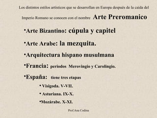 El documento describe los diferentes estilos artísticos medievales en Europa después de la caída del Imperio Romano, incluyendo el arte prerrománico, bizantino y árabe. También describe la arquitectura románica, su contexto histórico y social, y elementos arquitectónicos clave como las plantas de iglesias, bóvedas, arcos y cúpulas.