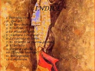 El documento resume la tauromaquia o arte de torear toros. Explica que torear es engañar al toro de forma ética y no burlarse de él. Describe los elementos clave como el toro bravo, el torero, la plaza de toros y las diferentes fases de una corrida como el indulto o triunfo del torero al salir por la puerta grande. Finalmente argumenta que la tauromaquia es una forma de vida y cultura en España aunque también genera controversia.