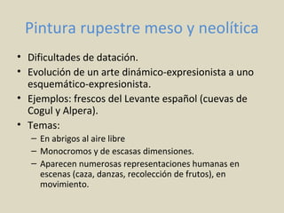 El documento analiza el arte neolítico, destacando su evolución desde la pintura rupestre hasta el arte esquemático, con énfasis en los frescos del levante español y los símbolos encontrados en cuevas, dólmenes y menhires. Se describe la transición de una cultura cazadora a una sociedad agrícola, junto con el desarrollo de la cerámica y la arquitectura, incluyendo los monumentos megalíticos como dólmenes y cromlechs. También se discuten las distintas funciones sociales y religiosas del arte, diferenciando entre las representaciones sagradas y la artesanía utilitaria.
