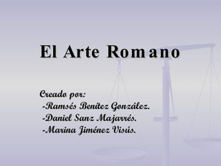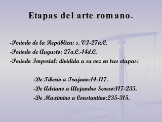 El documento resume las principales manifestaciones artísticas de la cultura romana como la escultura, arquitectura y pintura. Detalla importantes obras como la Estatua colosal de Trajano, el Templo de Fortuna Viril y el mosaico de los gladiadores que ilustran estas expresiones artísticas durante el Imperio Romano.