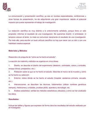 Este documento proporciona orientación sobre cómo escribir un artículo científico, incluyendo las secciones principales (resumen, introducción, materiales y métodos, resultados, discusión y bibliografía) y sugerencias sobre cómo estrcuturar el contenido dentro de cada sección. El objetivo general es ayudar a los investigadores a comunicar efectivamente los resultados de su investigación de una manera clara, objetiva y que pueda ser comprendida por la comunidad científica.