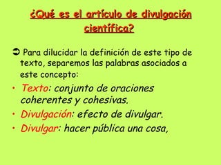 El documento explica que el artículo de divulgación científica es un texto que comunica información técnica de la comunidad científica al público en general. Describe que utiliza recursos como ejemplos, clasificaciones, definiciones y citas para hacer la información más accesible y comprensible. Además, señala que usa un lenguaje técnico y denotativo.