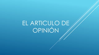 El artículo de opinión es un texto argumentativo y persuasivo que refleja el análisis de un autor sobre un tema de interés general. Su estructura incluye introducción, exposición de la tesis central, argumentación y conclusión, y se basa en la definición clara de un punto de vista sustentado con argumentos. Un artículo bien fundamentado busca impugnar y persuadir a través de conceptos, citas y pruebas.