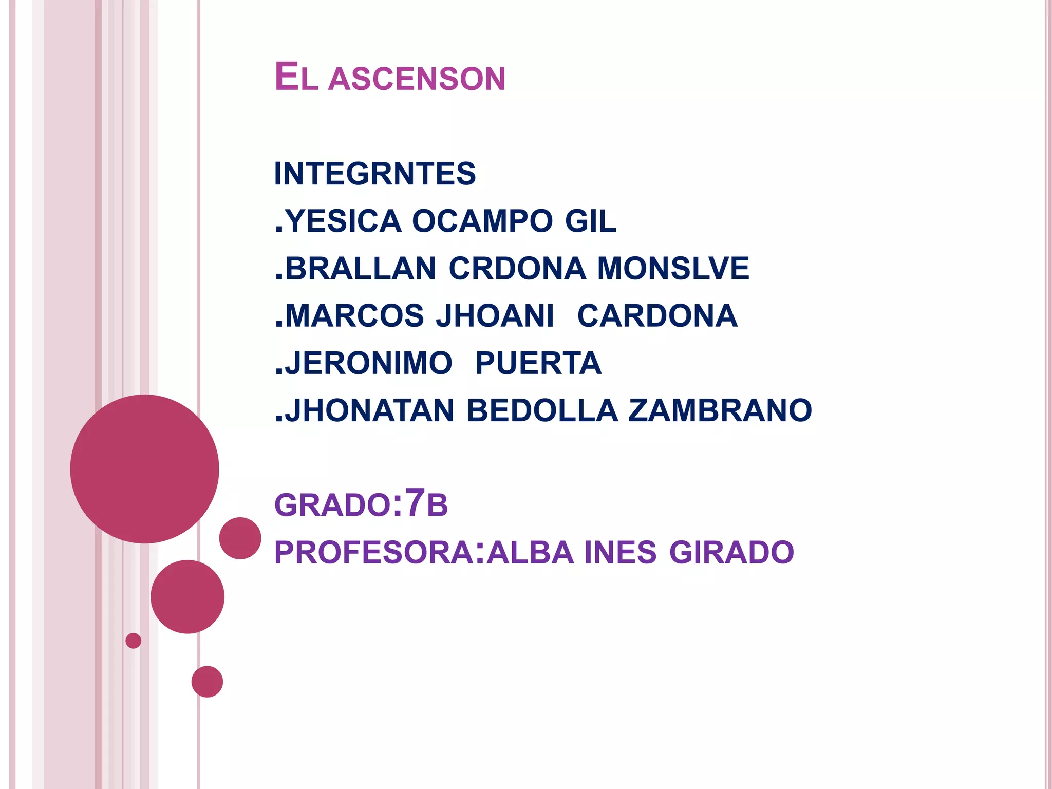 El documento presenta un proyecto de un ascensor que funciona con baterías recargables realizado por 5 estudiantes de 7mo grado bajo la supervisión de la profesora Alba Inés Girardo. El objetivo general del proyecto era crear un ascensor para facilitar las llegadas tarde y los objetivos específicos eran facilitar el movimiento a personas con discapacidad u otros problemas y evitar llegadas tarde.