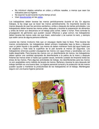 El cuidado personal incluye el aseo regular del cuerpo a través de la ducha, el lavado de la cara, los dientes, el cabello, los oídos, las manos y otras partes del cuerpo. Esto ayuda a prevenir infecciones y mantener una apariencia y salud óptimas. Los médicos recomiendan lavarse las manos frecuentemente, especialmente después de ir al baño o antes de comer, para evitar la propagación de gérmenes. Los trabajadores también deben lavarse las manos regularmente durante el día