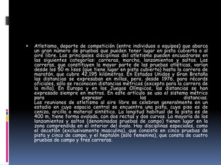 El documento proporciona una descripción general del atletismo. Explica que el atletismo incluye carreras, marcha, lanzamientos y saltos que se llevan a cabo en pista o al aire libre. Además, traza brevemente la historia del atletismo desde los Juegos Olímpicos griegos antiguos hasta su organización moderna a través de la IAAF.