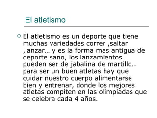 El atletismo es una de las formas más antiguas de deporte que incluye variedades como correr, saltar y lanzar. Para ser un buen atleta se requiere cuidar el cuerpo a través de una buena alimentación y entrenamiento. Los mejores atletas compiten en las Olimpiadas que se celebran cada 4 años. El atletismo ha existido por miles de años y las primeras competiciones organizadas fueron los Juegos Olímpicos griegos en el año 778 a.C.
