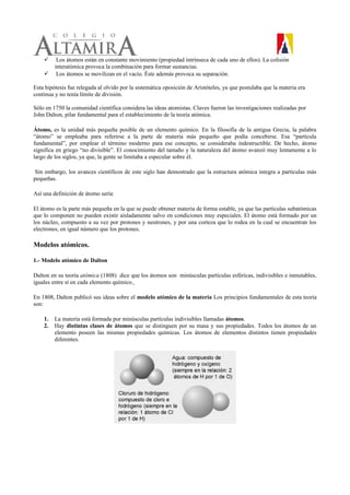 El documento resume la evolución del modelo atómico a través de la historia, desde las ideas de los filósofos griegos antiguos hasta el modelo propuesto por Niels Bohr en el siglo XX. Comienza con las ideas de los cuatro elementos de Empédocles y el modelo atómico de Demócrito, pasando por los modelos de Dalton, Thomson, Rutherford, y finalmente explicando los postulados clave del modelo de Bohr.