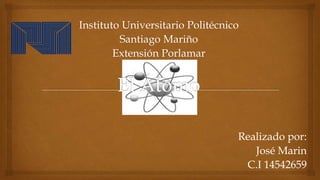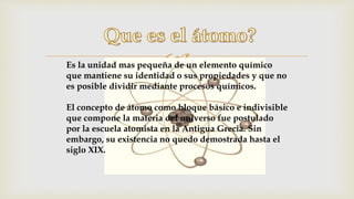 El documento resume la evolución del modelo atómico a través de la historia, desde la antigua Grecia hasta el modelo actual. Explica las partes del átomo como el núcleo, protones, neutrones y electrones. También describe los modelos atómicos propuestos por Demócrito, Dalton, Thomson, Rutherford y Bohr, culminando con el modelo actual basado en la mecánica cuántica de Erwin Schrödinger.