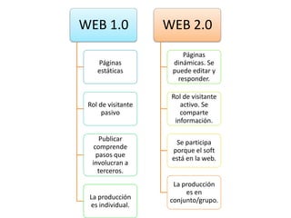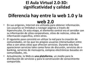 El documento describe la evolución de la web de la versión 1.0 a la 2.0, donde los usuarios pasaron de solo consumir información a crear y compartir contenido. También discute el aprendizaje en línea 2.0 utilizando redes sociales y herramientas como blogs y podcasts. Explica conceptos clave de la web 2.0 como los mashups y la sindicación de contenido. Adicionalmente, cubre temas como entornos 3D virtuales, el constructivismo, comunidades de aprendizaje y el uso creciente de