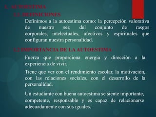 Este documento describe la autoestima, incluyendo sus definiciones, importancia, componentes y desarrollo. Define la autoestima como la percepción valorativa de nuestro ser. Explica que la autoestima afecta el rendimiento escolar, las relaciones sociales y el desarrollo personal. También describe las características de las personas con alta y baja autoestima.