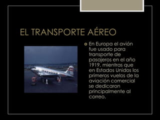 El documento describe la historia del transporte aéreo comercial desde sus inicios en Europa y Estados Unidos en la década de 1910 hasta la actualidad. Señala que los aviones fueron usados inicialmente para el correo antes que para pasajeros, y que aviones como el Douglas DC-3 popularizaron los vuelos de pasajeros en la década de 1920. Más tarde aparecieron aviones de reacción más grandes y rápidos como el Boeing 707 y 747 para rutas de larga distancia.