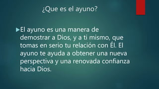 El documento habla sobre el ayuno y sus propósitos espirituales. Explica que el ayuno es una manera de enfocarse más en Dios y obtener una nueva perspectiva. También menciona que el ayuno no debe ser excesivo ni dañino para el cuerpo, y que no debe hacerse para parecer más espiritual. Luego enumera varios propósitos bíblicos del ayuno como fortalecer la oración y pedir ayuda a Dios. Finalmente, ofrece consejos prácticos sobre cómo planear y llevar a cabo un