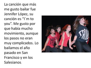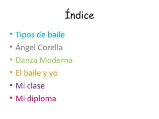 Este documento resume diferentes aspectos del baile, incluyendo varios tipos de baile, el bailarín favorito Ángel Corella, la danza moderna, las experiencias de baile de la autora desde los 6 años, su academia y profesora, los ejercicios de calentamiento en clase, y el diploma que recibió.