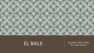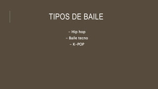 Este documento resume tres tipos de baile: hip hop, baile tecno y K-pop. Describe que el break dance es un estilo de baile acrobático del hip hop. El baile tecno se basa en movimientos de brazos similares al glowsticking. El baile es una parte integral del K-pop y ha ido evolucionando, con cantantes cambiando posiciones mientras bailan en sincronía.