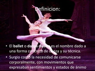 El documento define el ballet o danza clásica y describe su origen en Italia durante el Renacimiento. Explica los principales métodos como el ruso de Vaganova, el italiano de Enrico Cecchetti y el danés de August Bournonville. También describe las seis posiciones básicas de los pies, el uso de zapatillas punteras, y diferentes géneros de ballet como el cortesano, de acción y romántico. Finalmente, resalta las principales escuelas de ballet como la Ópera de París y el Royal Ballet