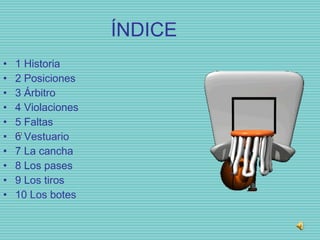 El documento proporciona una introducción al baloncesto, incluyendo su historia, posiciones, reglas básicas como violaciones y faltas, equipamiento, la cancha y diferentes tipos de pases y tiros. Explica que el baloncesto fue creado por James Naismith en 1891 y se ha convertido en uno de los deportes más populares a nivel mundial, con competiciones como la NBA.