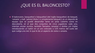 El baloncesto es un deporte de equipo que se juega entre dos equipos de cinco jugadores cada uno. Fue creado por James Naismith en 1891 para practicarse bajo techo durante el invierno. Se juega lanzando una pelota a una canasta colocada a 3.05 metros de altura. Existen variaciones como el streetball que permite reglas más libres.