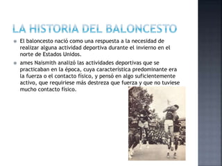 El documento describe el origen y las reglas originales del baloncesto, creado por James Naismith en 1891. Explica que Naismith buscaba un deporte de invierno que requiriera destreza en lugar de fuerza. Luego detalla las 13 reglas originales del baloncesto y brinda información sobre las ligas y jugadores más importantes de baloncesto en la actualidad.