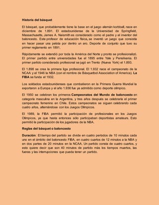 El documento proporciona una historia y explicación detallada de las reglas del baloncesto. Resume la historia del baloncesto desde su creación en 1891, las reglas básicas como la duración de los partidos, los equipos, infracciones y sistema de anotación. También describe las características de los diferentes tipos de jugadores y las dimensiones de la cancha de baloncesto.