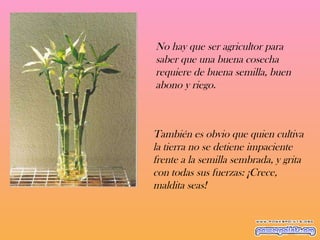 El documento habla sobre el crecimiento del bambú japonés y la lección que esto enseña sobre la paciencia. Explica que el bambú no muestra ningún crecimiento visible durante los primeros 7 años, pero que luego crece más de 30 metros en solo 6 semanas. Esto se debe a que durante esos 7 años iniciales el bambú está desarrollando un complejo sistema de raíces para soportar su rápido crecimiento posterior. De la misma forma, el éxito a menudo requiere tiempo y paciencia para desarrollar los cim