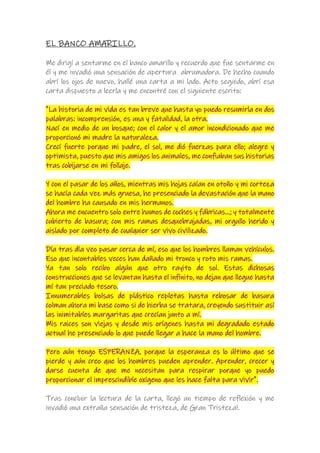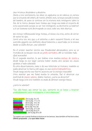 El documento narra la reflexión de un árbol solitario que recuerda su vida en armonía con la naturaleza y observa la devastación causada por el ser humano. A pesar de la tristeza por su estado degradado, el árbol mantiene la esperanza de que las personas puedan aprender a cuidar el medio ambiente. Además, se presentan alternativas de energía renovable como posibles soluciones a la crisis ecológica.