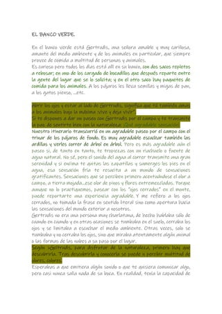El documento presenta a Gertrudis, una mujer amable y amante del medio ambiente que proporciona comida a personas y animales mientras disfruta de la naturaleza. Aboga por la importancia de la educación ambiental y la integración con el entorno, resaltando la necesidad de un conocimiento más profundo para fomentar el respeto hacia el medio ambiente. A través de sus experiencias, Gertrudis muestra que observar y escuchar el entorno puede enriquecer la conexión con la naturaleza.