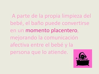 El documento ofrece consejos para bañar a un bebé de manera placentera, incluyendo medir la temperatura del agua, usar jabón y champú neutros, sonreír y hablar con el bebé durante el baño, secarlo suavemente, hidratar su piel y peinarlo antes de vestirlo con ropa limpia.