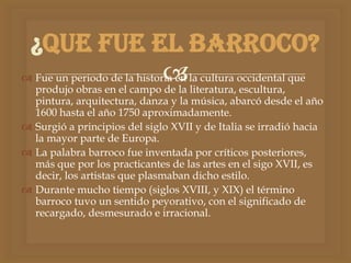 El Barroco fue un periodo cultural entre 1600 y 1750 que se caracterizó por obras de arte contrapuestas al Renacimiento, destacando el pesimismo y desengaño. Se desarrollaron nuevos géneros artísticos como la pintura de bodegones y paisajes, la arquitectura utilizó materiales pobres para crear estructuras majestuosas, y la música floreció con la creación de nuevas formas como la sonata, concierto y ópera.
