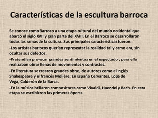 El documento describe las características culturales del período Barroco en Europa entre los siglos XVII y XVIII. Se destacan logros en literatura, música, ciencia, arquitectura, pintura y escultura. En literatura y música brillaron autores como Shakespeare, Molière, Cervantes, Vivaldi y Bach. En ciencia, Galileo, Kepler y Newton hicieron importantes descubrimientos. En arquitectura sobresalen obras como la Plaza de San Pedro. En pintura, destacan Caravaggio, Rembrandt, Rubens y Velázquez