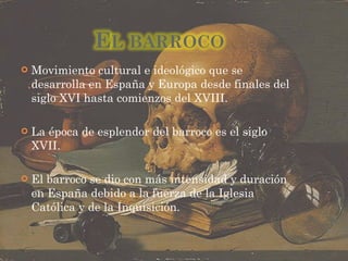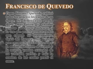 El documento presenta información sobre cinco investigadores y editores que estudian a importantes autores del Siglo de Oro español como Sor Juana Inés de la Cruz, Lope de Vega, Francisco de Quevedo y Tirso de Molina. También resume las características principales del movimiento barroco en España, incluyendo temas como la muerte, el amor y la apariencia engañosa de las cosas. Incluye además biografías y obras de estos autores barrocos.