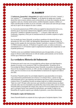 El documento describe brevemente el origen y las reglas básicas del baloncesto. Fue inventado en 1891 por James Naismith como un deporte que se pudiera practicar bajo techo durante el invierno. Consiste en que dos equipos de cinco jugadores intentan anotar la mayor cantidad de puntos lanzando un balón a una canasta colocada a 3 metros de altura. El partido dura cuatro períodos de 10 a 12 minutos cada uno y gana el equipo que anote más puntos.