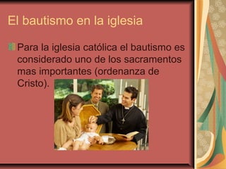 El bautismo es considerado uno de los sacramentos más importantes en la iglesia católica. Inicialmente se impartía solo a adultos, pero desde el siglo IV también se empezó a impartir a niños bajo la garantía de la fe de sus padres. El bautismo consiste en que la persona al nacer se une a la comunidad cristiana y debe seguir el camino de Cristo. Existen tres maneras de bautizarse: inmersión, aspersión y ablución.