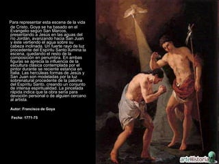 El documento presenta resúmenes de varias obras pictóricas que representan el Bautismo de Cristo realizadas por diferentes artistas entre los siglos XV y XVII. Describe las composiciones, figuras y elementos visuales clave de cada obra, así como breves detalles biográficos de los artistas y el contexto histórico y estilístico.