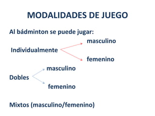 Este documento describe las diferentes modalidades de juego del bádminton, incluyendo individual y dobles para hombres, mujeres y mixtos. Explica los equipamientos necesarios como la raqueta y el volante, así como las reglas básicas sobre puntos y faltas. Resume los pasos para realizar el saque, incluyendo la posición del cuerpo y el movimiento de brazo.