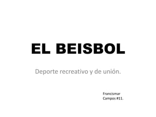 El documento habla sobre el béisbol. Explica que es un deporte recreativo y de unión jugado entre dos equipos de 9 jugadores cada uno, cuyo objetivo es golpear una pelota con un bate e intentar anotar carreras corriendo alrededor de las bases antes de ser eliminado. También describe los elementos básicos de un campo de béisbol como las distancias entre las bases y el lanzador, y concluye que se requiere perseverancia y constancia para lograr ser un pelotero profesional.