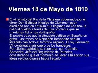 El documento describe los eventos que llevaron a la Revolución de Mayo de 1810 en Argentina, cuando se destituyó al virrey español y se creó una Junta de gobierno patriota. Luego de varias reuniones entre patriotas y el virrey, se convocó a un Cabildo Abierto donde se votó a favor de reemplazar al virrey. Finalmente, el 25 de mayo se aceptó la renuncia del virrey y se estableció formalmente la Primera Junta de Gobierno de Argentina.