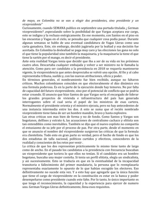 El documento analiza la fórmula presidencial de Santos-Vargas para las próximas elecciones. Aunque inicialmente parece una alianza lógica, también conlleva riesgos debido a que la selección de Vargas obedece a cálculos políticos para ganar en primera vuelta. Vargas aportará votos y popularidad, pero su rol como vicepresidente podría generar conflictos con los ministros. La fórmula es criticada por ser elitista y centralista aunque sus proponentes son políticos experimentados.