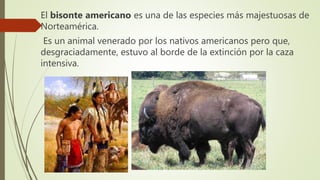 El bisonte americano es la especie más grande de América del Norte, venerada por los nativos americanos pero que estuvo cerca de la extinción debido a la caza excesiva. Habitaban originalmente las grandes llanuras de Norteamérica pero hoy su distribución es dispersa, la mayoría en granjas para consumo humano en lugar de estado salvaje. Son animales herbívoros que se alimentan principalmente de pastos y juncos mediante un proceso de rumia.