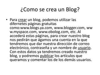 Este documento explica cómo crear un blog y las ventajas de tener uno. Para crear un blog, se necesita una cuenta en páginas como Blogger o WordPress dando un correo electrónico, contraseña y nombre de usuario. Los blogs sirven para buscar trabajo mostrando tus intereses y opiniones, estudiar compartiendo material académico, y mejorar el lugar de trabajo compartiendo ideas. Cuando solo se permiten videos e imágenes, se puede subir otros archivos a Google Sites y enlazarlos al blog.