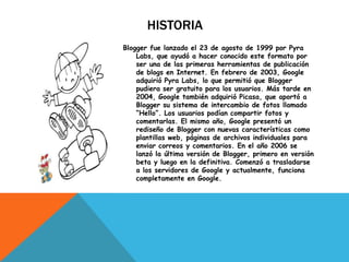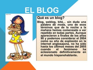 Este documento define qué es un blog y describe su historia y características principales. Explica que un blog es una publicación en línea con historias presentadas en orden cronológico inverso que permite comentarios. También describe cómo surgieron con herramientas como Blogger, su facilidad de uso, y cómo se forman comunidades en torno a blogs sobre temas específicos.
