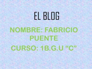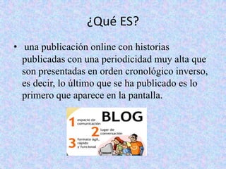 Un blog es una publicación online con historias publicadas en orden cronológico inverso. Permite tener presencia en Internet para ofrecer productos y servicios, establecer una marca personal o empresarial, y facilitar la interacción con otros. Un blog se caracteriza por contener texto, imágenes y videos, permitir comentarios y suscripciones, y organizar artículos de forma cronológica.