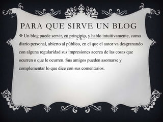 Este documento define un blog como un sitio web donde uno o más autores publican artículos de forma cronológica. Los blogs permiten a los autores publicar sus ideas y opiniones sobre diversos temas y permiten a los lectores participar a través de comentarios. Los blogs pueden servir como diarios personales abiertos al público.