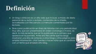 El documento define un blog como un sitio web que funciona como un diario personal en línea actualizado con frecuencia por su autor. Explica que los blogs muestran los contenidos en orden cronológico inverso y ofrecen enlaces a otras páginas. Además, resume la historia de los blogs desde 1994 y algunas de sus características como la facilidad de uso, comentarios de lectores y suscripción RSS. Finalmente, describe diferentes usos de los blogs como blogs docentes, de eventos, de aula y de centros educativos.