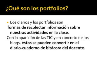 Un portfolio electrónico puede animar a los estudiantes a reflexionar sobre su propio aprendizaje y es considerado una herramienta de autoevaluación y desarrollo profesional. Los blogs pueden usarse como diarios digitales para docentes, permitiéndoles documentar su trabajo, fomentar un pensamiento crítico y la autoevaluación. Los portfolios electrónicos pueden incluir programas, evaluaciones, exámenes corregidos y otras contribuciones de los docentes.